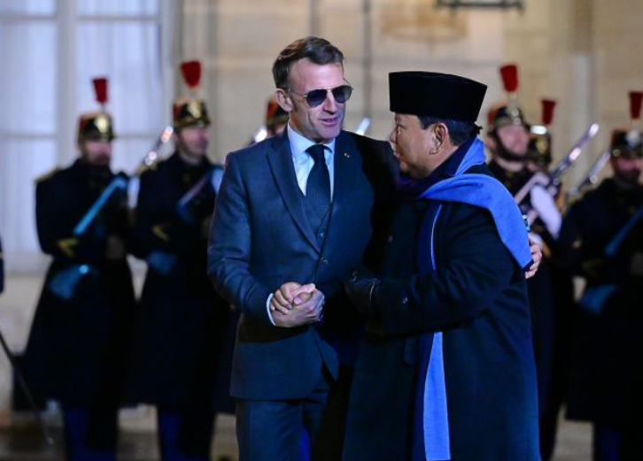 Momen pertemuan dua pemimpin negara itu semakin hangat ketika Presiden Macron, yang masih mengenakan kacamata aviator berlensa biru, menyambut langsung Presiden Prabowo di pelataran istana.