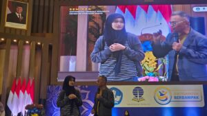 Saya minta penanya yang angkat tangan itu naik ke panggung. Saya minta dia berdiri di sebelah saya.